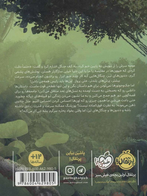 سرش را از ننو به پایین خم کرد، به کف جنگل اشاره کرد و گفت: «حتما دقت کردی که حیوون ها در مقایسه با ما با این دنیا خیلی سازگارتر هستن. پوشش های پشمی گرم، دندون های تیز، چنگال هایی که کار چند جور ابزار رو براشون انجام می ده، سرعت بیشتر، پرش های بلندتر، حتی پرواز. اون ها باید رئیس همه چی باشن! اما جک و جونورها نمی تونن برای هم داستان بگن و این تنها نقطه ی قوت ماست.