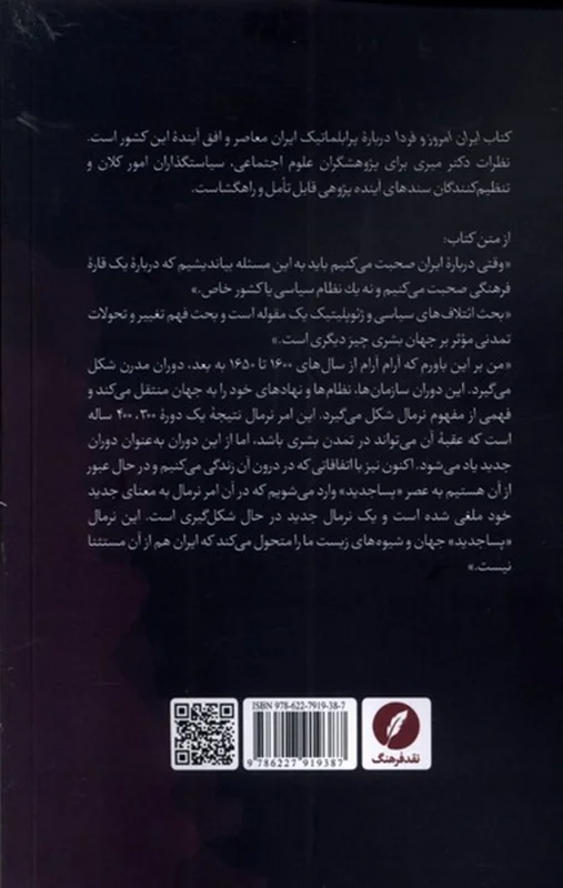 «وقتی دربارۀ ایران صحبت میکنیم باید به این مسئله بیاندیشیم که دربارۀ یک قارۀ فرهنگی صحبت میکنیم و نه یک نظام سیاسی یا کشور خاص.» «بحث ائتلافهای سیاسی و ژئوپلیتیک یک مقوله است و بحث فهم تغییر و تحولات تمدنی موثر بر جهان بشری چیز دیگری است.» «من بر این باورم که آرام آرام از سالهای 1600 تا 1650 به بعد، دوران مدرن شکل میگیرد. این دوران سازمانها، نظامها و نهادهای خود را به جهان منتقل میکند و فهمی از مفهوم نرمال شکل میگیرد. این امر نرمال نتیجۀ یک دورۀ 300، 400 ساله است که عقبۀ آن میتواند در تمدن بشری باشد، اما از این دوران بهعنوان دوران جدید یاد میشود. اکنون نیز با اتفاقاتی که در درون آن زندگی میکنیم و در حال عبور از آن هستیم به عصر «پساجدید» وارد میشویم که در آن امر نرمال به معنای جدید خود ملغی شده است و یک نرمال جدید در حال شکلگیری است. این نرمال «پساجدید» جهان و شیوههای زیست ما را متحول میکند که ایران هم از آن مستثنا نیست.»