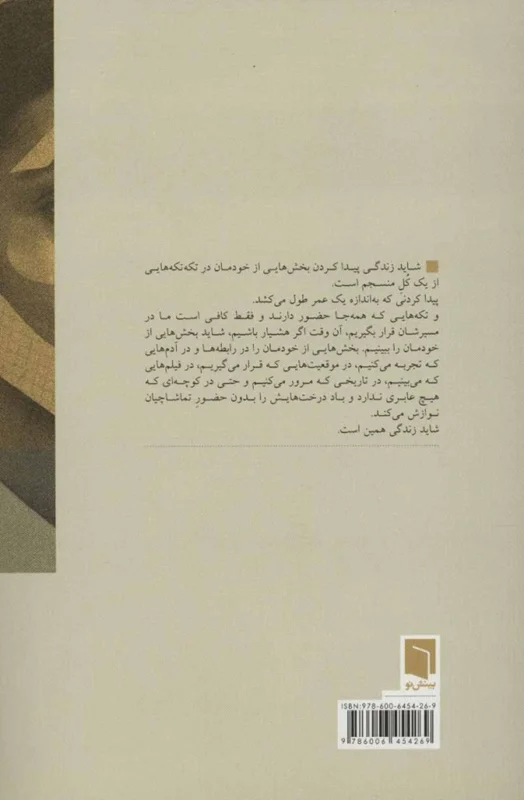 اين کتاب تکههايي از يک کل منسجم است. کلي که هنوز تکميلنشده اما در مسير پيدا شدن و بيرون آمدن از ابهام است. شايد این کتاب بتواند بخشهايي از درونِ شما را بيدار کند و به پيدا شدن بخشهاي گمشدهتان کمک کند.