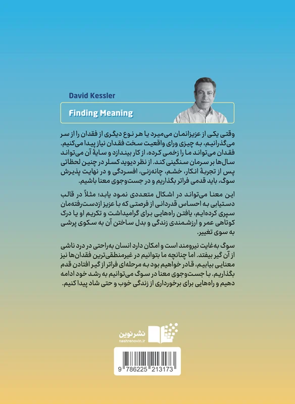 وقتی یکی از عزیزانمان میمیرد یا هر نوع دیگری از فقدان را از سر میگذرانیم، به چیزی ورای واقعیت سخت فقدان نیاز پیدا میکنیم. فقدان میتواند ما را زخمی کرده، از کار بیندازد و سایۀ آن میتواند سالها بر سرمان سنگینی کند. از نظر دیوید کسلر در چنین لحظاتی پس از تجربۀ انکار، خشم، چانهزنی، افسردگی و در نهایت پذیرش سوگ، باید قدمی فراتر بگذاریم و در جستوجوی معنا باشیم.