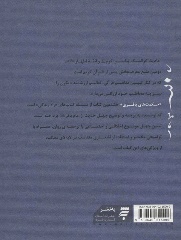 کتاب "حکمت های باقری" با عنوان کامل "راه زندگی 8: چهل حدیث از امام باقر (ع)"، نوشته "جواد محدثی" توسط نشر به منتشر شده است. این کتاب به عنوان هشتمین اثر از مجموعه کتابهای "راه زندگی" توسط نویسنده منتشر شده است و در آن ترجمه و توضیح چهل حدیث از امام باقر (ع) ارائه شده است.در این کتاب، ترجمهی روان و معنی حدیثها به همراه توضیحهای مختصر ارائه شده است. همچنین، از اشعاری که به موضوعات مطرح شده در حدیثها مرتبط هستند، در کتاب استفاده شده است. این کتاب با بررسی چهل موضوع اخلاقی و اجتماعی از دیدگاه امام باقر (ع) به مخاطبان مفاهیم ارزشمندی را انتقال میدهد و از ویژگیهای بارز آن میتوان اشاره کرد.