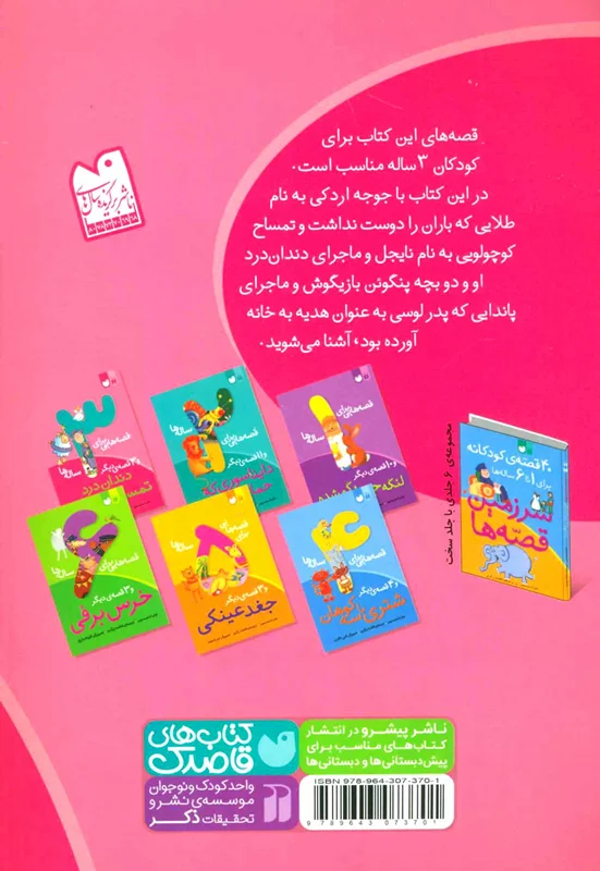 قصههای این کتاب برای کودکان 3 ساله مناسب است. در این کتاب با جوجه اردکی به نام طلایی که باران را دوست نداشت و تمساح کوچولویی به نام نایجل و ماجرای دندان درد او و دو بچه پنگوئن بازیگوش و ماجرای پاندایی که پدر لوسی به عنوان هدیه به خانه آورده بود، آشنا میشوید.