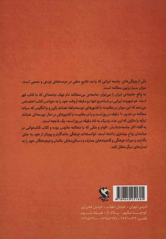 یکی از ویژگی های جامعه ایرانی که واجد نتایج منفی در عرصه های فردی و جمعی است، میزان بسیار پایین مطالعه است. به واقع جامعه ی ایران را می توان جامعه ی بی مطالعه نام نهاد. جامعه ای که با کتاب قهر است. هر شهروند ایرانی در شبانه روز تنها دو دقیقه از وقت خود را به خواندن کتاب اختصاص می دهد که این میزان در مقایسه با کشورهای توسعه یافته همانند ژاپن و یا انگلیس که سرانه مطالعه در حدود 90 دقیقه در روز است و یا در مقایسه با کشورهای در حال توسعه ای همانند ترکیه یا مالزی که این عدد نزدیک به 55 دقیقه در روز است، یک فاجعه است. به گفته اکثر جامعه شناسان، اقوام و مللی که با مطالعه مانوس بوده و کتاب کتابخوانی در میانشان رواج بیشتری داشته است، توانسته اند فرهنگی ماندگارتر و پویاتر از خود به جای بگذارند و میراث فرهنگی و گنجینه های معارف و دستاوردهای عالمان و فرهیختگان خود را به نسل های دیگر منتقل کنند.