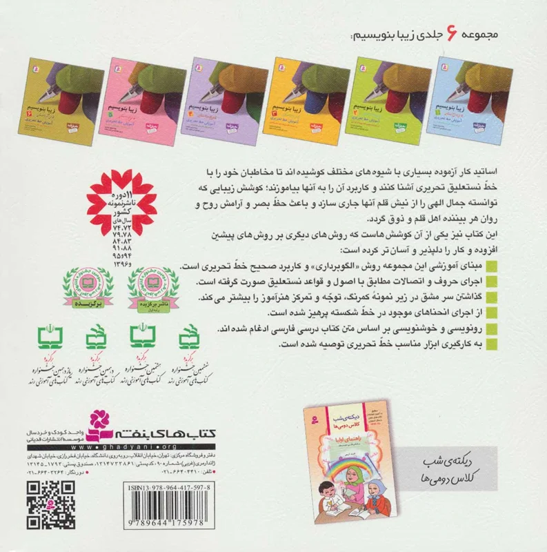 کتاب زیبا بنویسیم پنجم دبستان از سری کتاب های انتشارات قدیانی است که این کتاب برای خوشنویسی و زیبا تر نوشتن مناسب است.