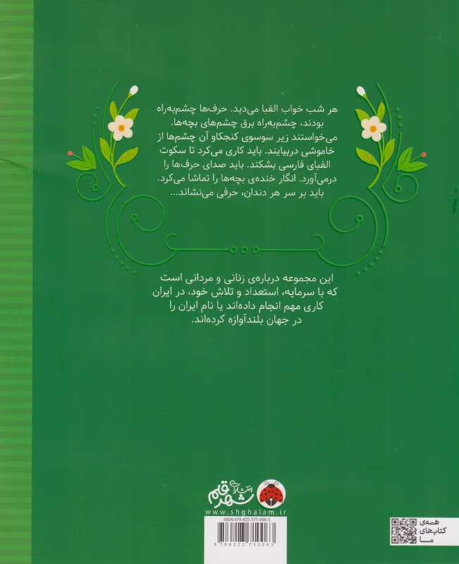 هر شب خواب الفبا میدید. حرفها چشم به راه بودند، چشم به راه برق چشمهای بچهها. میخواستند زیر سوسوی کنجکاو آن چشمها از خاموشی در بیایند. باید کاری میکرد تا سکوت الفبای فارسی بشکند. باید صدای حرفها را در می آورد. انگار خنده بچه ها را تماشا میکرد. باید بر سر هر دندان حرفی مینشاند...این مجموعه دربارهی زنانی و مردانی است که با سرمایه، استعداد و تلاش خود در ایران کاری مهم انجام دادهاند یا نام ایران را در جهان بلند آوازه کرده اند.