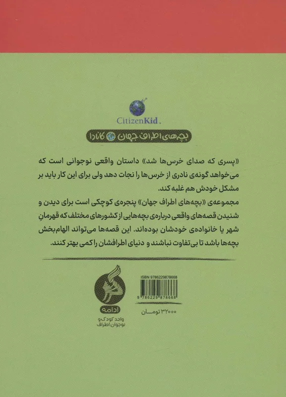 «پسری که صدای خرسها شد» داستان واقعی نوجوانی است که میخواهد گونهی نادری از خرسها را نجات دهد ولی برای این کار باید بر مشکل خودش هم غلبه کند.مجموعهی «بچههای اطراف جهان» پنجرهی کوچکی است برای دیدن و شنیدن قصههای واقعی دربارهی بچههایی از کشورهای مختلف که قهرمان شهر یا خانوادهی خودشان بودهاند. این قصهها میتواند الهامبخش بچهها باشد تا بیتفاوت نباشند و دنیای اطرافشان را کمی بهتر کنند. این قصهها هم به بچهها اطلاعاتی دربارهی تنوع و تفاوتهای زندگی بچهها در نقاط مختلف دنیا میدهد و هم آنها را با موضوعاتی مثل حفظ محیطزیست، کمک به همنوع، راهاندازی کسبوکار، کمک به اقتصاد خانواده و… آشنا میکند ولی از همه اینها مهمتر این مجموعه یاد بچهها میاندازد که جهان خیلی بزرگ است و برای تعامل با بچههای دیگر جهان اول باید با زندگی و قصههای آنها آشنا شوند.