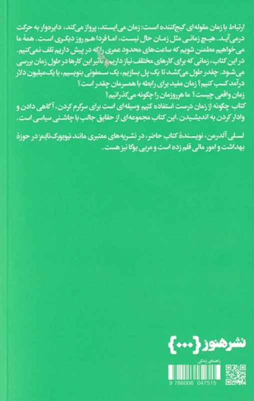 در عصری که زمان ما دچار شکست و مخاطره می شود، کتاب تایمز خوانندگان را تشویق می کند تا در زمان استفاده و زمان صرف شده فکر کنند. چقدر طول می کشد تا یک همسر جدید پیدا کنید، یک همبرگر را هضم کنید، یا یک سمفونی بسازید؟ چقدر زمان صرف خیال پردازی، پیامک و آماده شدن برای کار می کنیم؟ این کتاب باورهای ما را به چالش میکشد و ما را ترغیب میکند که چگونه و چرا برخی چیزها سریعتر میشوند، برخی چیزها کند میشوند و برخی چیزها هرگز تغییر نمیکنند (نیاز به هفت تا هشت ساعت خواب).